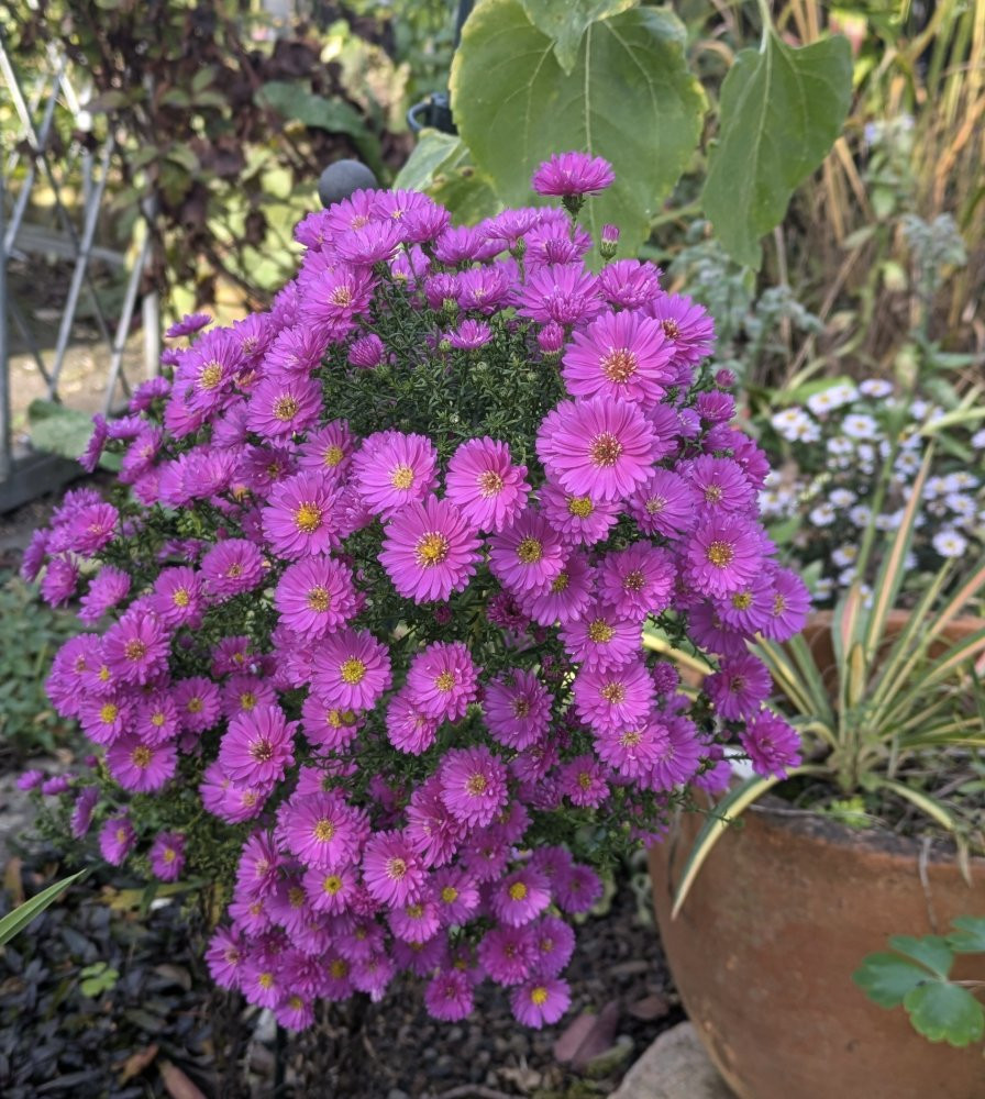 Ich bin auch noch auf der Suche nach den besten Sorten, die zumindest einige der ohne Zweifel vorhandenen Vorzüge vereinen, ohne allzu viel Schattenseiten aufzuweisen. Vielleicht sollte ich mich dabei stärker auf die Staudensichtungs-Ergebnisse verlassen. Dann hätte ich mir vermutlich die Aster Novae-belgii Crimson brockade erspart. So eine tolle Farbe und im ersten Standjahr auch wunderbar üppig. In diesem Jahr allerdings ist sie schon deutlich mickeriger und die Blüte nur noch spärlich. Die Farbe gefällt mir aber nach wie vor. Vielleicht kann ich eine Methode finden, die ihr dauerhaft zum alten Glanz verhilft. Oder eine vergleichbare, aber wüchsigere Sorte?