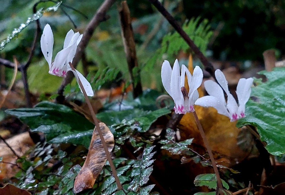 Hier blüht's auch in weiß ( Chrysanthemum 'Poesie' , Cyclamen cyprium ), und in Rosarot ( Rose 'Augusta Luise')
