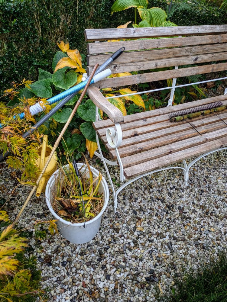 Hinter dem Schlitzahorn die erste Schmuddelecke am Teich, sie wird durch den Ahorn verdeckt: Diverse Kescher, eine Plastikgießkanne und ein Eimer.