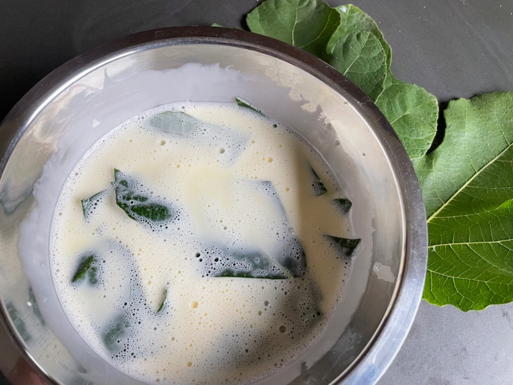 Ich habe vorhin noch Öl vorbereitet und für das Feigenblättereis frische Blätter in Ei, Zucker und Sahne eingelegt.