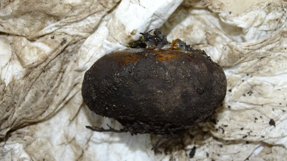 Sie fangen außen an und fressen eine Höhlung in die Knolle. Oder eine Halbhöhle. Das öffnet Fäulnisbakterien Tür und Tor.