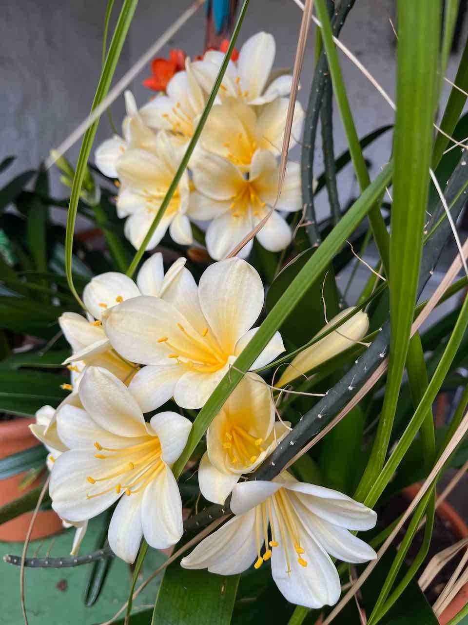 Die gelbe Clivie hat im Sommerquartier im Schatten eines Baums eine Nachblüte bekommen, wohl durch den vielen Regen und dann durch die Hitze angeregt.