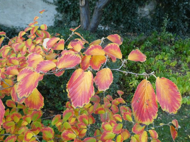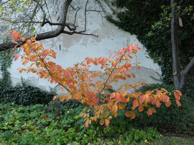 Meine bei den Schneeglöckchentagen als 'Pallida' gekaufte Zaubernuss (O-Ton Gärtnerei Blütenreich: "Die echte!" - Ist womöglich die anderswo auch als 'Fred Chittenden' gehandelte Sorte gemeint?) fängt immer schon recht früh mit der Laubfärbung an, dieses Jahr Ende September/Anfang Oktober. Manchmal schillert das Laub in allen Regenbogenfarben, manchmal ist es glutrot, dieses Jahr eher orangerot, womöglich ist dies von den Witterungsbedingungen und von der Bodenfeuchtigkeit abhängig. Dieses Jahr ist sie wirklich übersät mit Blütenknospen, das wird im kommenden Jahr ein Feuerwerk!