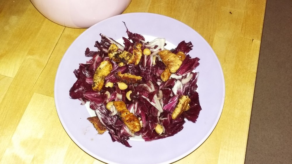 Hier gab es Radicchiosalat mit Kichererbsen, roter Zwiebel und gebratenem Putenfleisch.