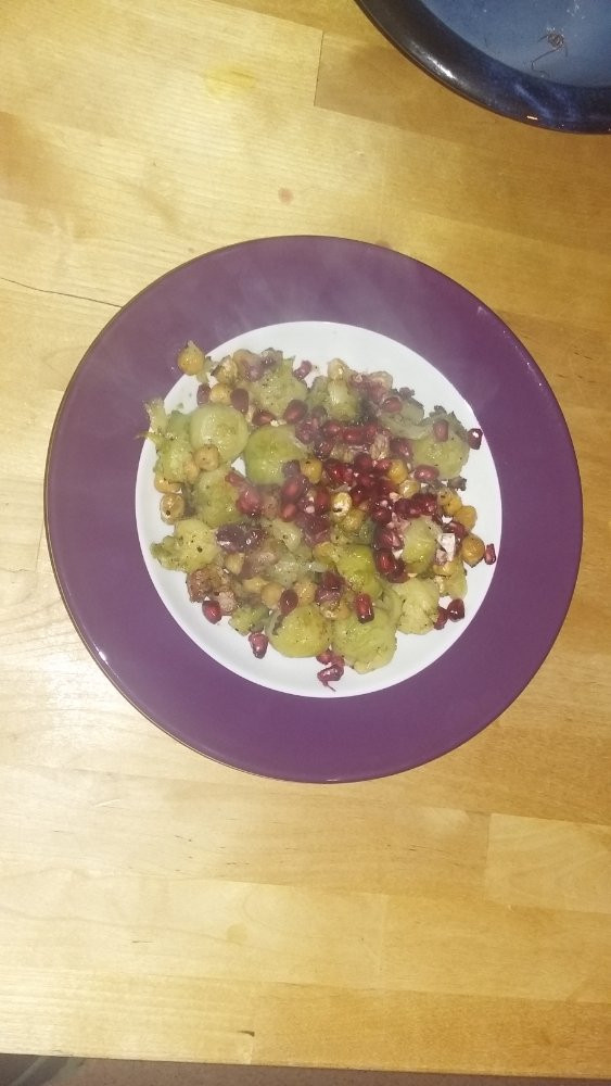 Hier gab es Rosenkohl aus der Pfanne mit Kichererbsen, knusprigen Pancetta und Granatapfelkernen - sehr lecker