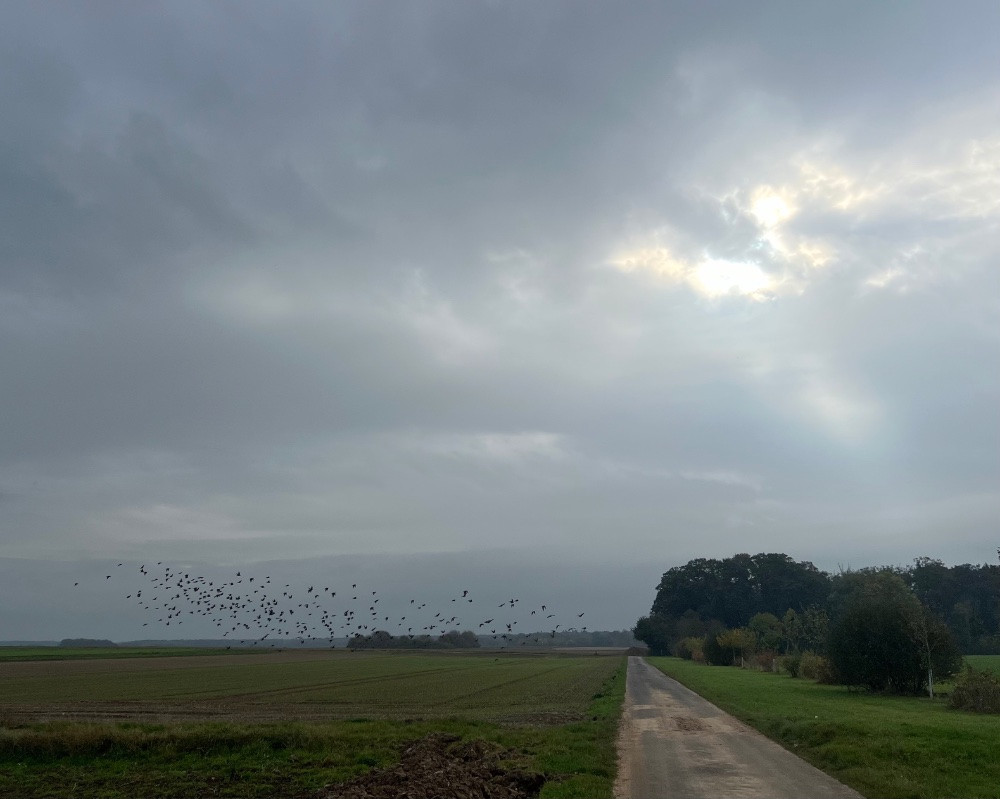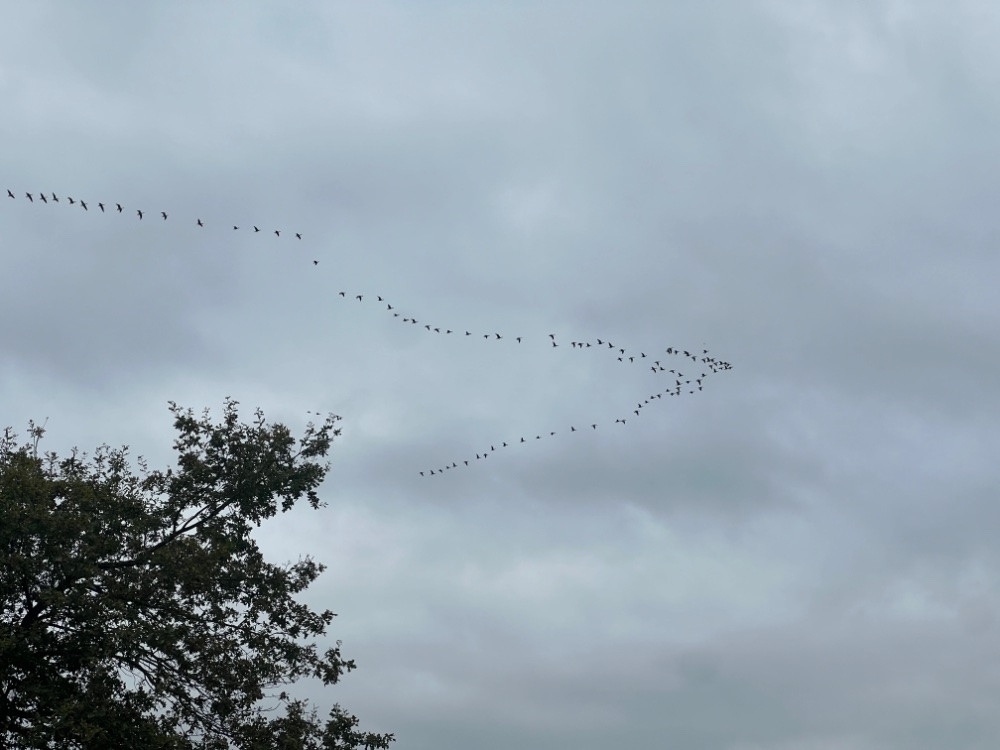 Spätherbstliche Radtour, dann dieses Schreien am Himmel. Da ziehen sie dahin. Ich denke ans Frühjahr, wenn sie zurückkommen.