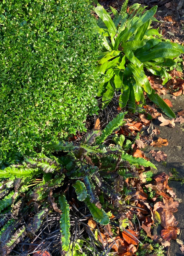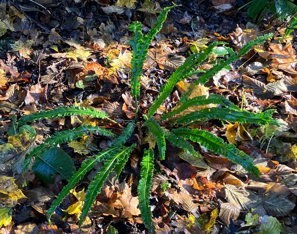 Der vordere Hirschzungenfarn sieht nicht mehr aus wie neu, den hat wohl ein Pilz im Laufe des Sommers bös erwischt. ( Laub jetzt entfernen? Oder kommt‘s jetzt auch nicht mehr drauf an und ich mach’s besser im Frühling?)