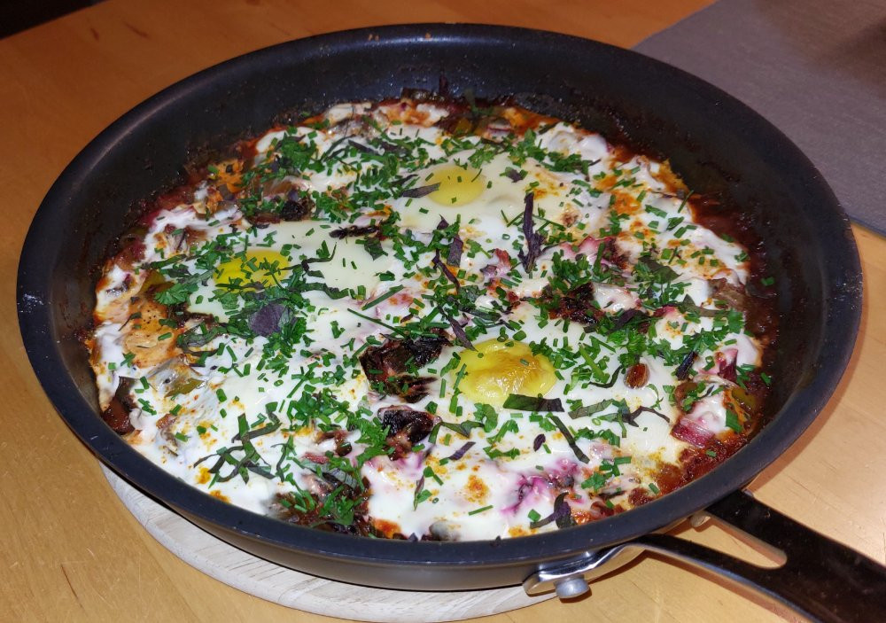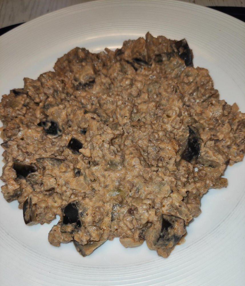 - Pfannen-Moussaka (Hack, Aubergine gewürfelt, Zwiebel, Brühe, Tomatenmark,ganz viele Gewürze u.a. Kreuzkümmel, Zimt, zum Schluss Schmand)