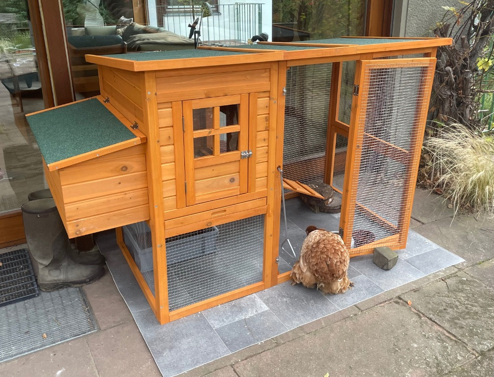 Wir haben jetzt einen kleinen Hühnerstall bestellt, der direkt auf die Terrasse kommt. Das Huhn wird dann Sichtkontakt zum Wohnzimmer haben, in dem wir uns meistens aufhalten. :) Wenn ich im Garten bin, ist sie eh bei mir.