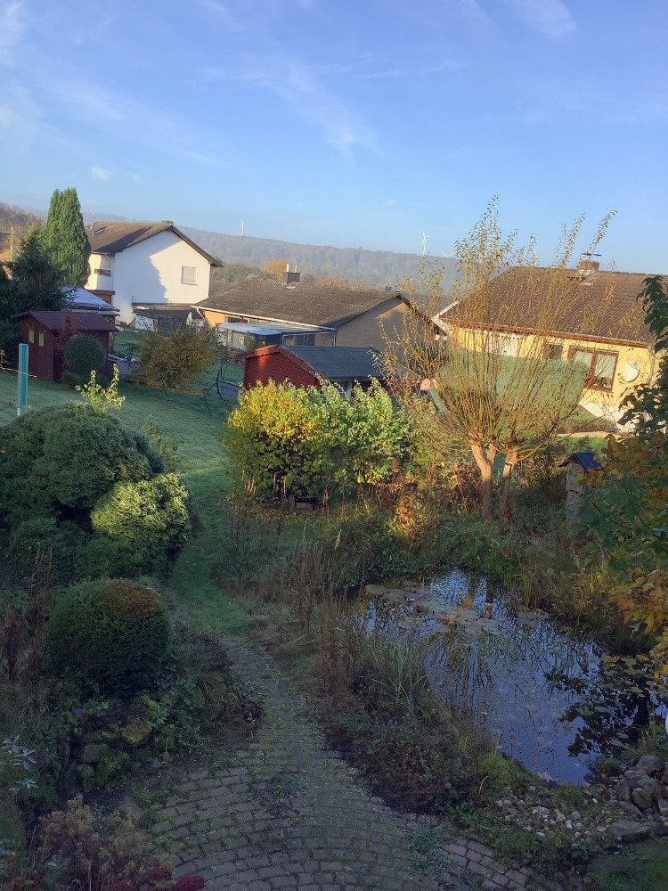 In der Nacht ging es auf 3°C herunter, unten im Garten waren es sicher noch 1,5°C weniger. Nun hängt wieder dichter Nebel bei 5°C im Tal. Mal schauen, ob die Sonne es heute schafft, den Nebel aufzulösen.