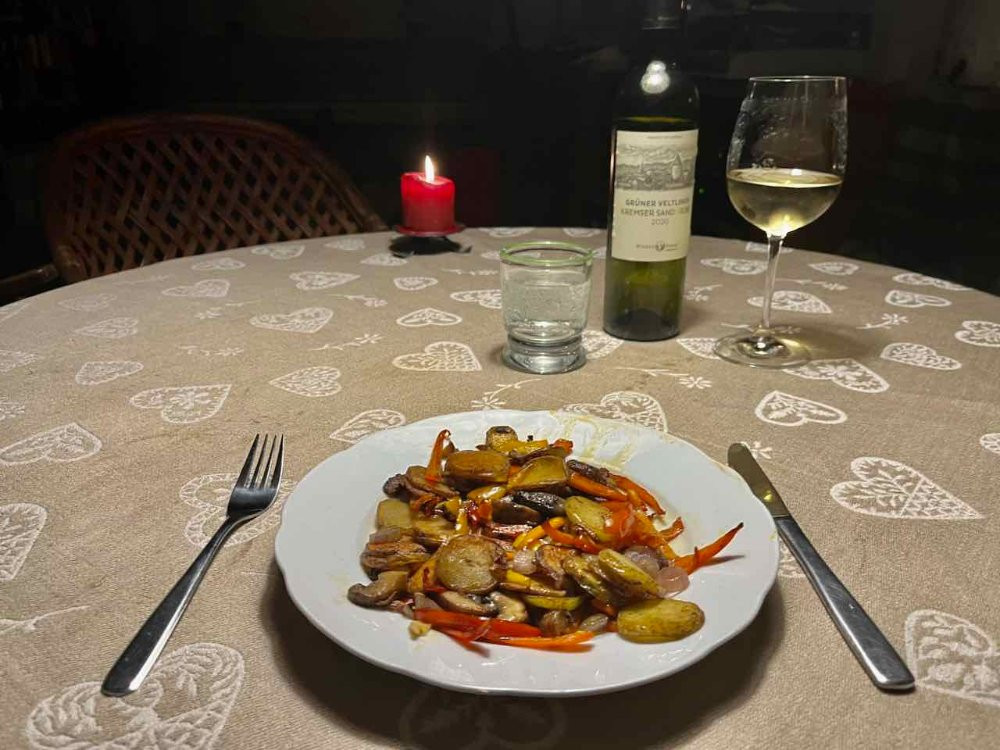 Eintopf bzw. Einteller: Kartoffel-Paprika-Champignon-Pfanne zum Grünen Veltliner aus der Wachau