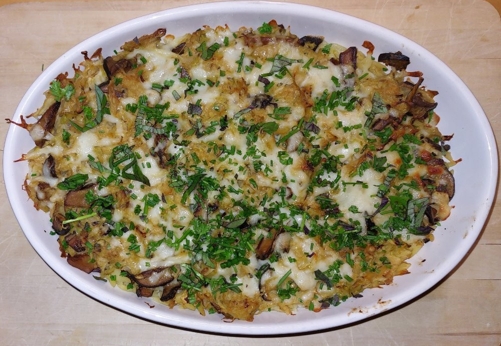 Spitzkohl mit Maronenröhrlingen und Kritharaki im Ofen überbacken, dazu der erste Gartenendivien