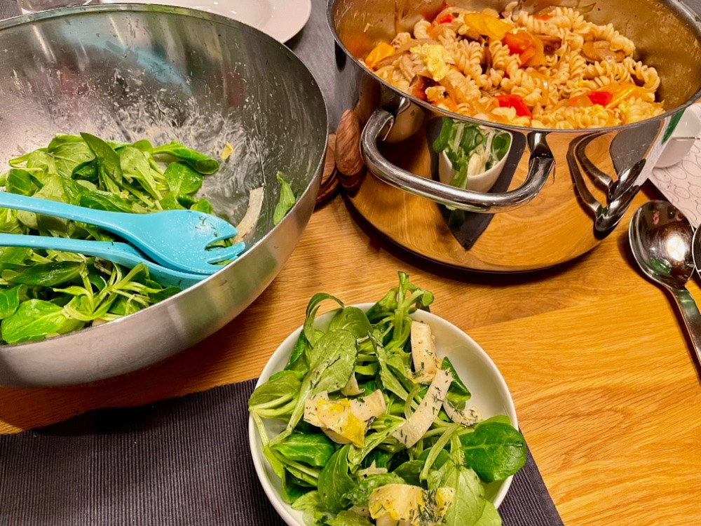 gestern köstlich und wunderbar entspannt nüsslisalat mit chicorée und nudeln mit zwiebeln, peperoni und kalbsbratwursthalbmöndli…