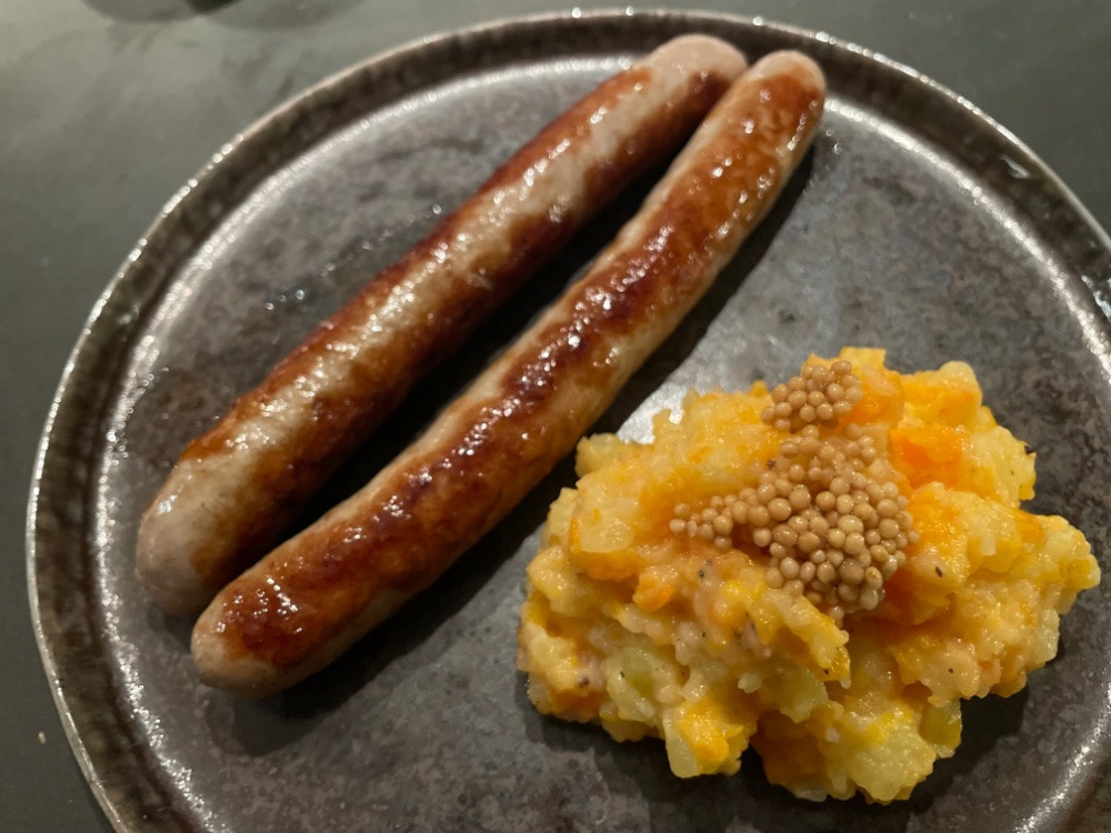 Fenchel- und Wildschwein-Bratwurst mit Röstkartoffeln, eigene Tomaten und Frisee-Salat