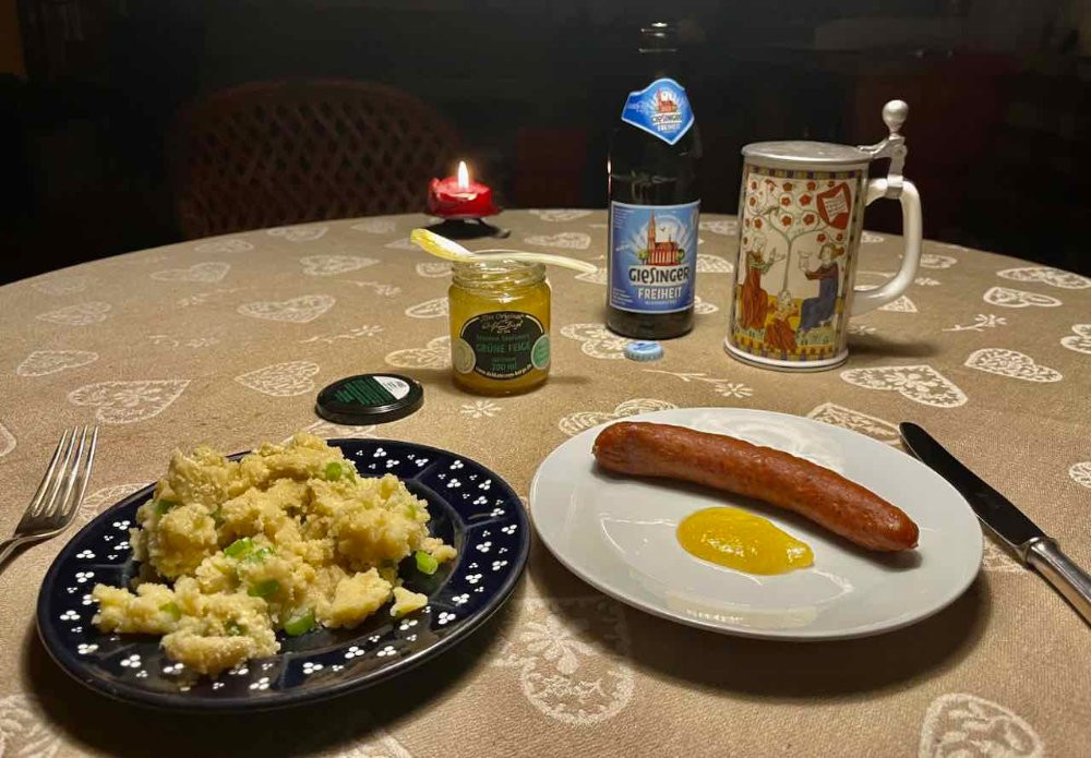Heute Abend ein Experiment: Bergwurz gesotten und mit Tessiner grünem Feigensenf sowie Kartoffelbrei mit Frühlingszwiebeln zur "Giesinger Freiheit".