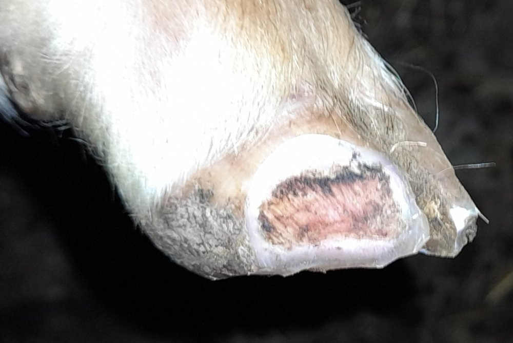 Das hier... ist eine ausgeschnitte Tasche. Das hat nix mit Moderhinke zu tun. In nassen Jahren reicht ein kleines Steinchen. Wenn sich das aufweitet, steht dahinter Dreck. Und das im Nassen. Die Tiere lahmen lange nicht. Würden wir nicht turnusmäßig im Herbst schneiden... au weia. Die Klaue so ausgeschnitten und desinfiziert wächst ganz problemlos nach.