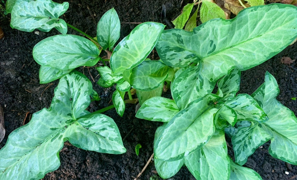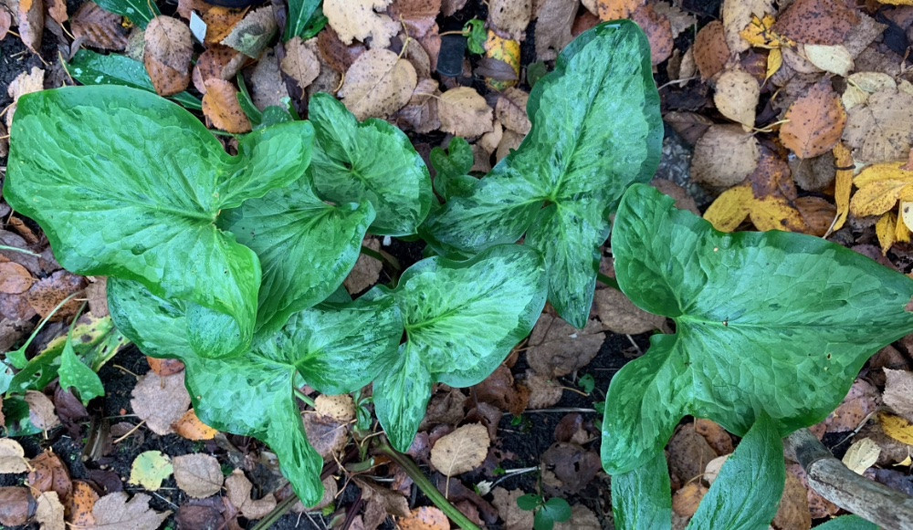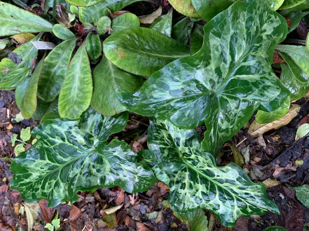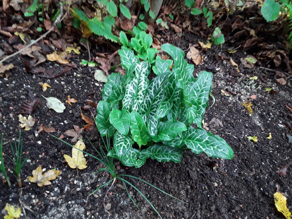 Foto 2: Mein momentaner Liebling ist ‚Thunderbolt and Lightning‘. Dieser Arum kommt aus den USA und erhielt seinen Namen von John Lonsdale. Es zeichnet sich durch helle Blattadern aus und bekommt bei zunehmender Kälte dunkle Punkte.