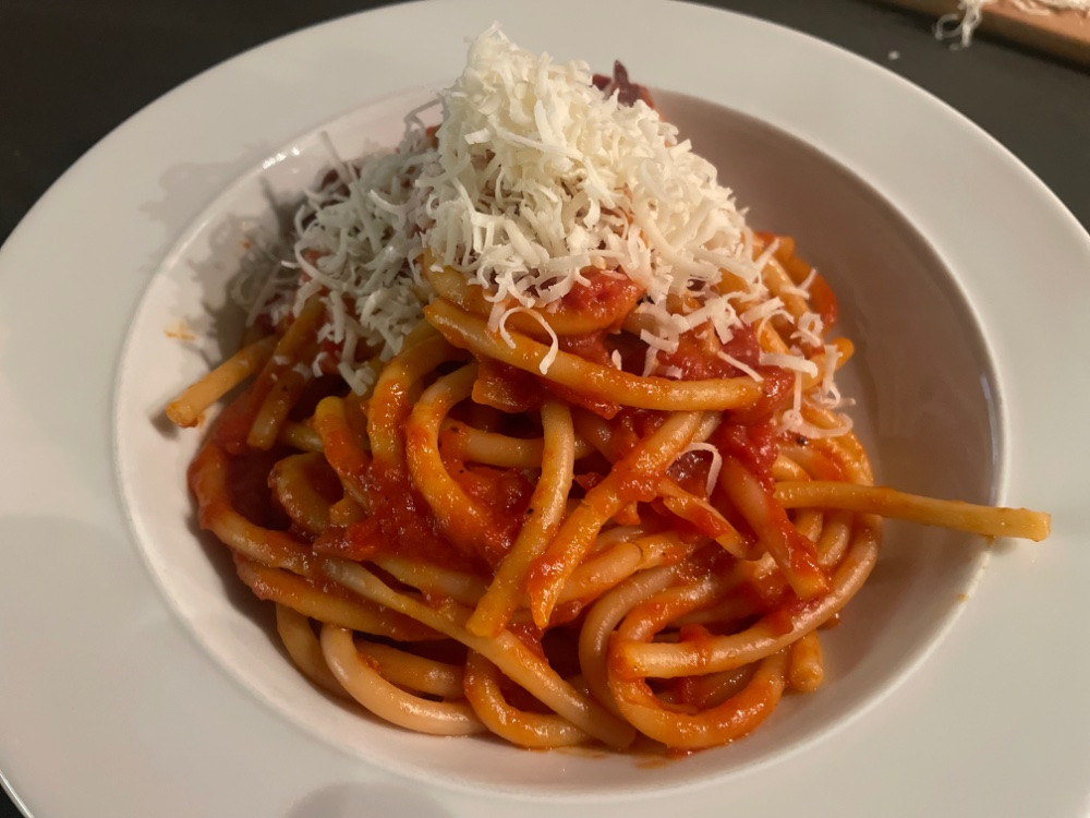 Hier gab es auch Pasta. Bucatini alla puttanesca.