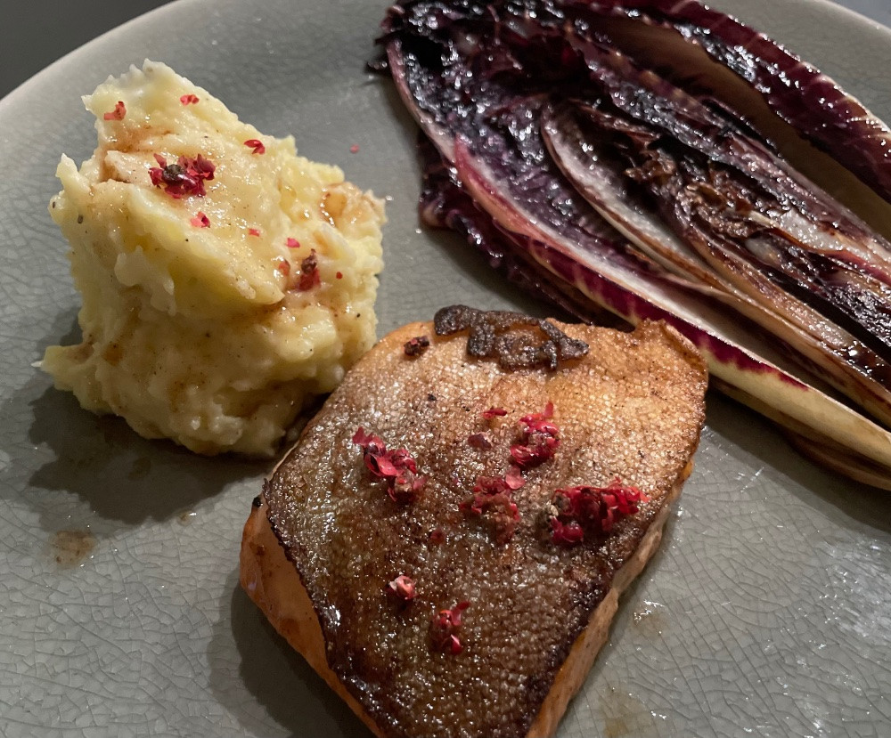 Bei uns gab es heute Lachs, Radicchio und Kartoffelstampf.