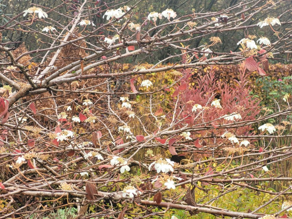 Erstaunlich ist in diesem Jahr die zweite Blüte von Viburnum mariesii... und immernoch.