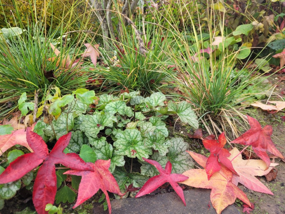 Auf so einen sonnigen Moment warte ich auch schon seit Wochen, aber die Zeitspanne, in der im November die Sonne schien, lässt sich in Minuten messen... Ungewöhnlichen Ansichten aus Deinem Garten, da kann auch der "Rücken entzücken". ;) Das rote Amberbaumlaub zwischen den immergrünen Stauden ist ausgesprochen malerisch! Was ist das für ein kleines Sträuchlein im Vordergrund am Plattenweg zwischen Amberbaum und Ahorn?