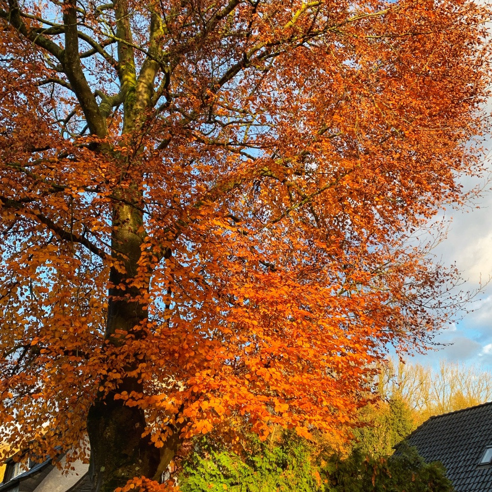 Diese blutbuche hat auch eine ausgesprochen lange Herbstfärbezeitraum und hat jetzt einen leuchtenden orange Ton