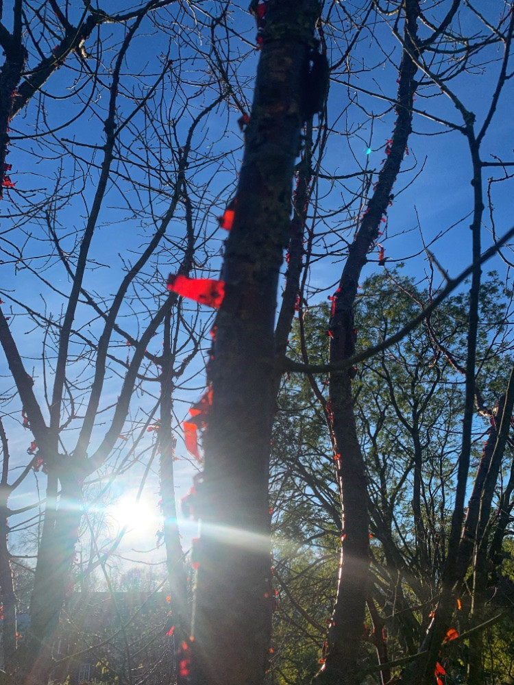 Im Gegenlicht leuchtet, es wirkt fast als hätte jemand rot gefärbtes Epoxidharz an den Baum