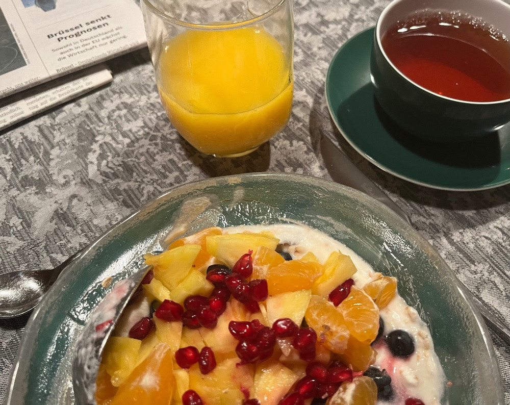 Ich hatte zum Frühstück (Sonnenblumenkernbrot mit Sirup, Erdnussbutter und Marmelade bestrichen - ohne Butter ;) ) schon Schokoladen-Panna Cotta - sehr gesund für die Seele bei diesem tristen Wetter ;D ;)