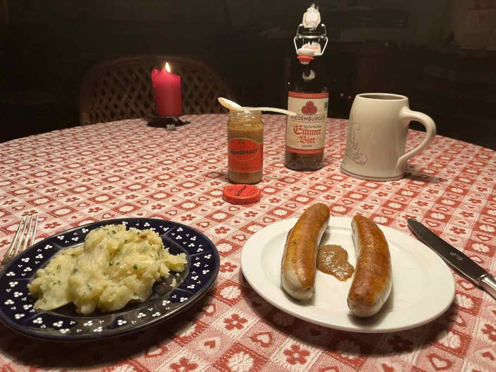 Wir waren heute unheimlich fleißig, haben zu zweit vier Ster Holz verschlichtet und gönnen uns jetzt was: Geräucherte Bratwürste mit Sauerkraut und Kartoffeln. Ein schlichtes bayerisches Wohlfühl-Essen