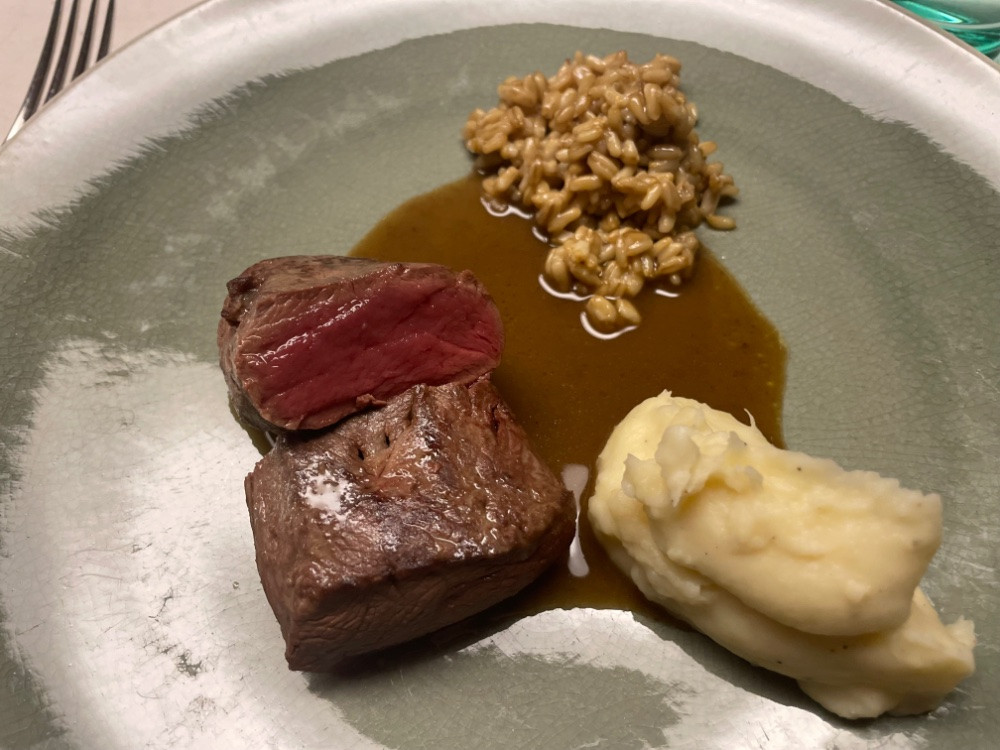 Rehrücken mit Nackthafer ;D (das klang so lustig) und Kerbelknollenpüree. Der Rehrücken sieht viel roter aus, als er war. Kerntemperatur 55°C. Für Blüten und Blätterdeko war das Wetter einfach zu schlecht. Ich hatte keine Lust durch den Garten zu flitzen bei Regen.