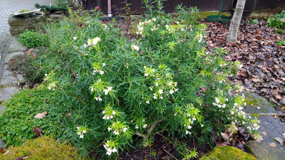 Die Choisya Aztec Pearl hat diesen Herbst eine kräftige Nachblüte.
