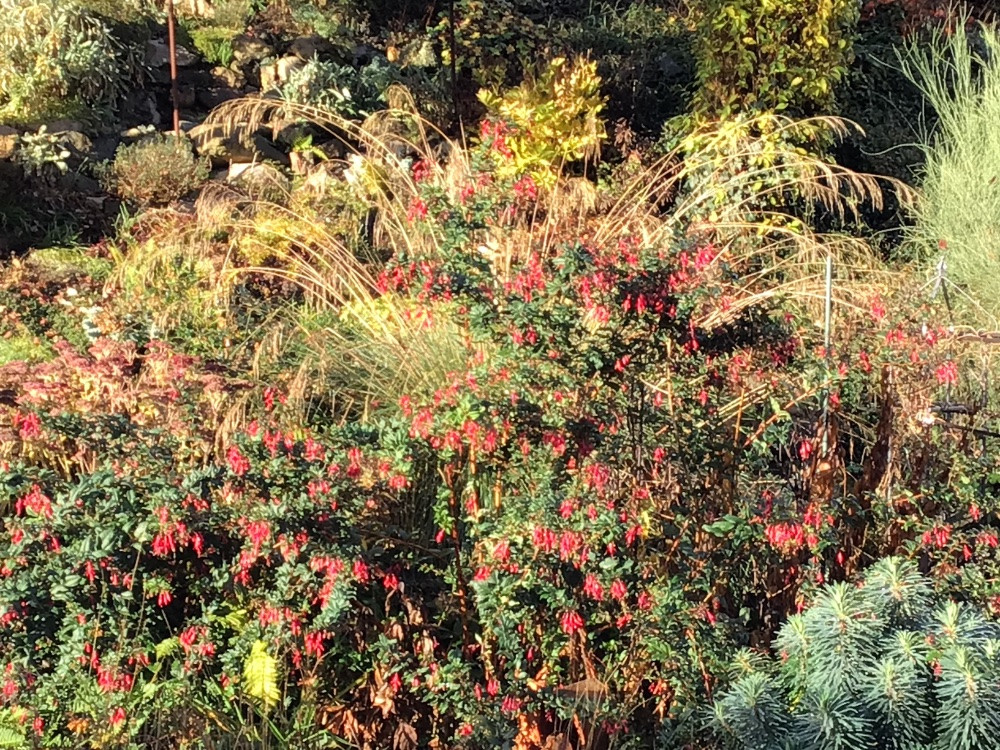 Der letzte Blütenhöhepunkt ist meine Fuchsie. Sie läuft immer erst im Herbst zur Hochform auf und blüht dann bis zum Frost, wenn ich Glück habe bis weit in den Dezember hinein. Leider verweigert sie schöne Fotos in Natura immer viel schöner als auf den Fotos