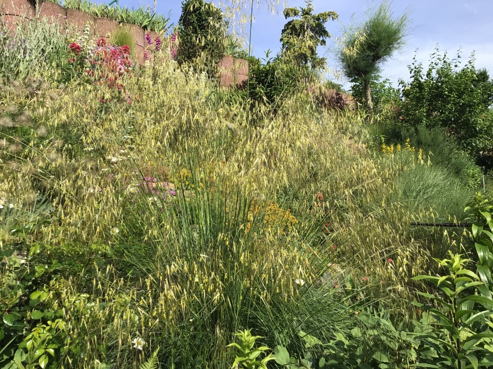 Es ist Stipa gigantea. Es steht allerdings bereits eine Etage höher auf einer etwa 70 cm hohen Trockenmauer. Auf der ersten Terrasse meines Hanges, die Fuchsie am Fuß der Mauer. Ist eher nicht als gemeinsamer Aspekt gedacht. Das Gras als Blickfang für den Sommer.