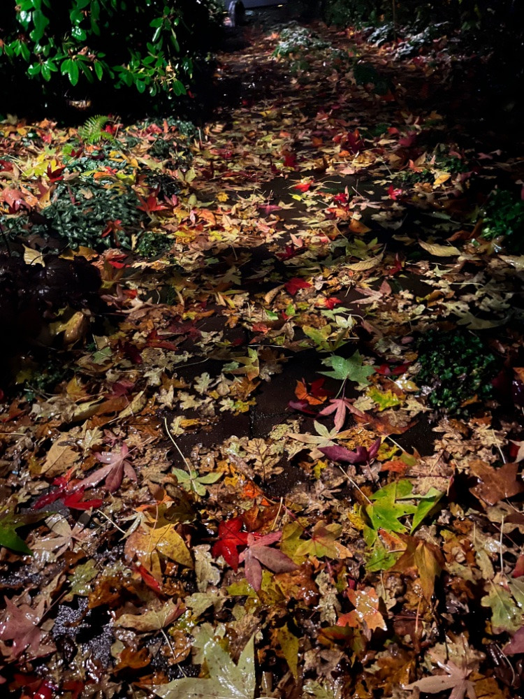 Gartenarbeit war unmöglich. Die Einfahrt ist vollgeschüttet mit buntem Amberlaub. Auf der Fugenvegetation liegt ein Schneehäubchen. Auf dem Foto stehe ich an der baumfernsten Stelle, wieviel Laub es tatsächlich ist, sieht man nicht wirklich, aber man kann sehen wie schön das Laub aussieht.