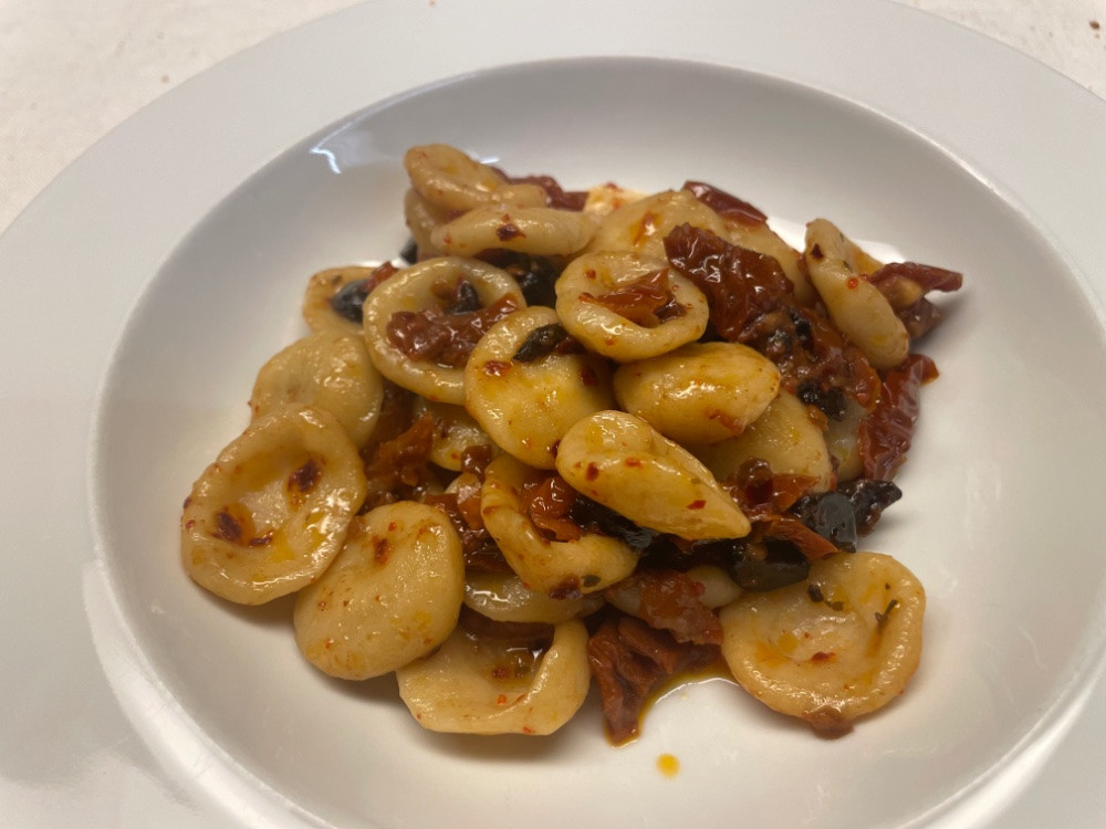 Bei uns gab es gestern aus dem Rest Pastateig Orecchiette nochmals mit Aglio Nero e Olio. Und eben habe ich mit unseren reifen Restminitomaten, Kartoffeln, Basilikum und Knoblauch zwei Hühnerschenkel in den Ofen verfrachtet. Ganz schrecklich ist, dass sie dort eine Weile verbringen und der Duft einen fast wahnsinnig macht ...![]()
