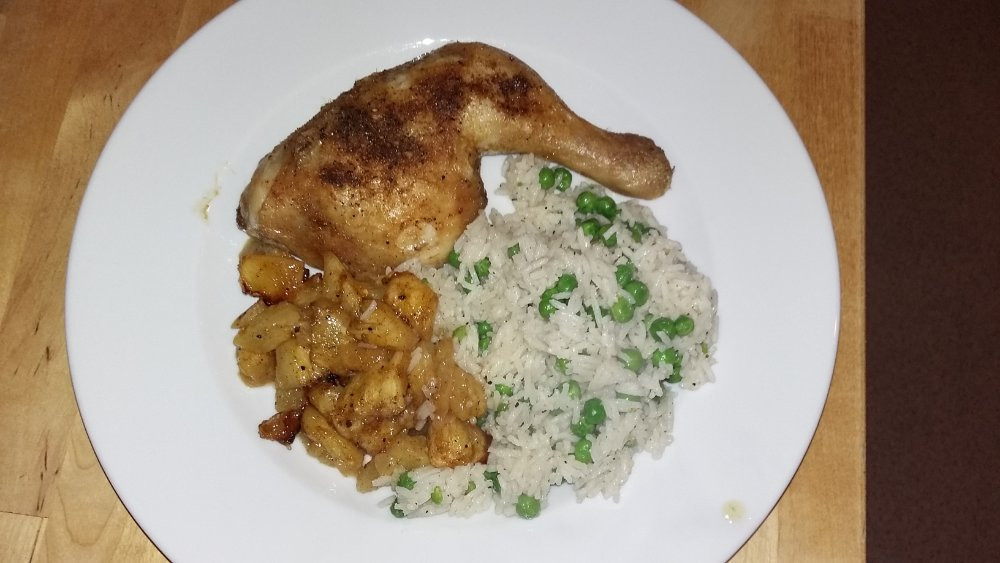 Hier gab es Hähnchenkeule auf einem scharfen Ananasbett und dazu Basmatireis mit Erbsen. Es hat schon geschmeckt, war aber geschmacklich etwas farblos.