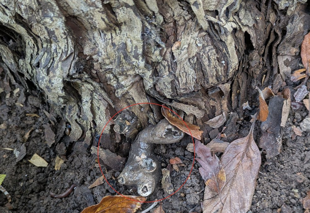 Habe mal eines von diesen Gebilden am Fuß des Stamms markiert. Davon war jede Menge rund herum, hatte es aber zusammen mit Laub größtenteils unbeabsichtigt entfernt.