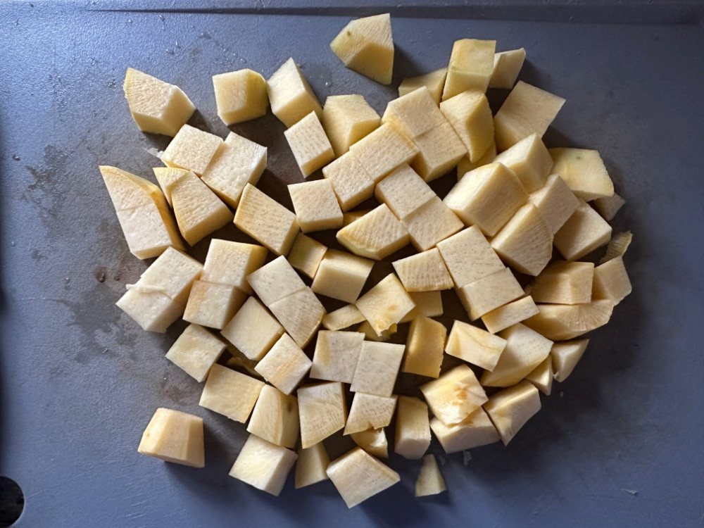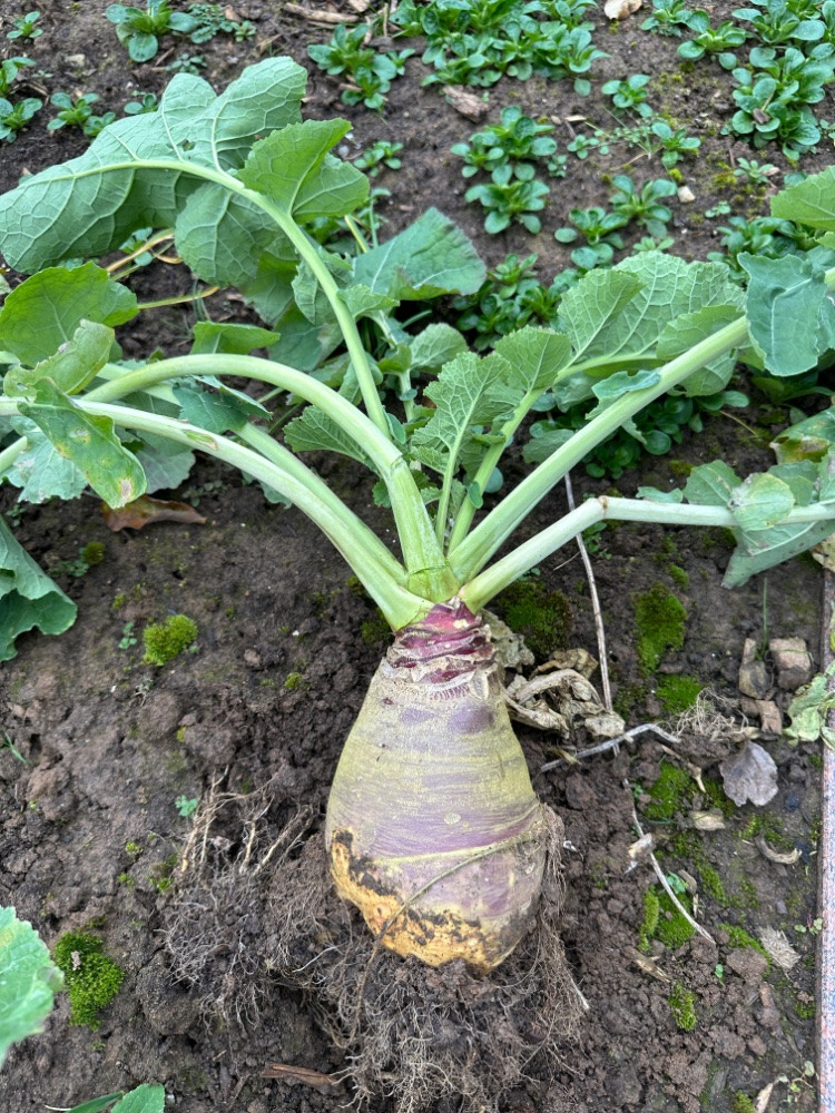 Herrlichste Kohlrübensaison. Heute wieder eine grosse "Ruby" gezogen, die Sorte mag ich gerne. Ist auch hübsch. Im jetzigen Reifezustand zart, mit Süsse, mildwürzig. Gekochte Würfelchen mit Kreuzkümmel und Chayenne-Pfeffer anbraten. Beilage zu Vielem.