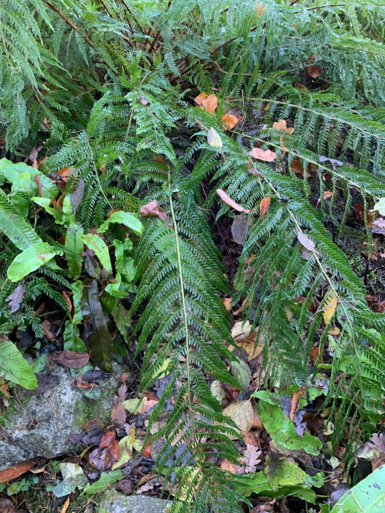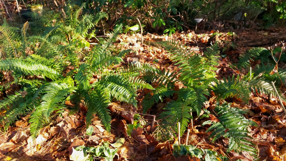 Herbstl. Farngarten : Matteuccia struthiopteris, verschiedene Schildfarne ( polyblepharum, braunii, plumosum densum, aculeatum )