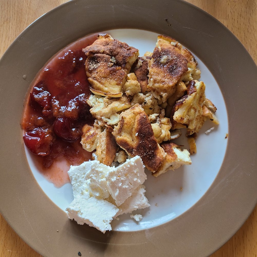 Mittags im Homeoffice lowcarb Kaiserschmarrn mit Zwetschgenkompott und polnischem Quark
