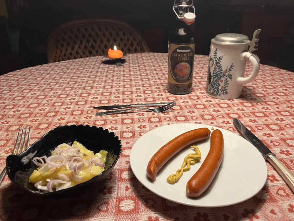 Debreziner gesotten und lauwarmer Kartoffelsalat mit Schalotten zum Hermannsdorfer Schweinsbräu Dunkel