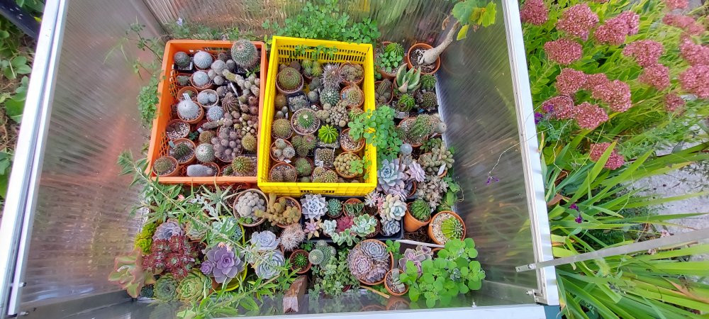 Hier schon nach der Jäten und einräumen die Kakten/Sukkulenten Kisten. Die wachsen wieder zwischen die Kisten durch. Im Sommer war alles von den überwuchert.