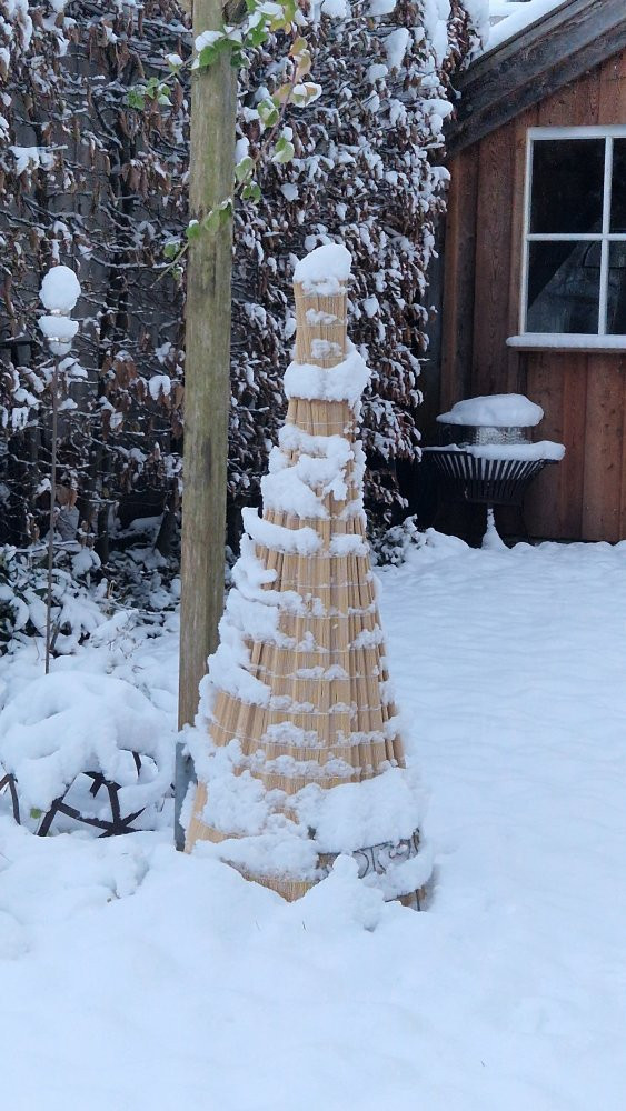 Meine RdB hab ich jetzt das 2. Jahr im Garten. Schutz bekommt sie noch 1-2 Jahre mit einem runden Gitterkomposter, den ich mit Stroh gefüllt hab. Ich hatte noch alte Bambusrollos, die hab ich rundherumgewickelt und nen alten Regentonnendeckel drauf. Dieses Jahr habe ich versuchsweise eine LdA ausgepflanzt. Ab und zu stocher ich vorsichtig ein bißchen im Stroh rum, in der Hoffnung, es den Mäusen ungemütlich zu machen.