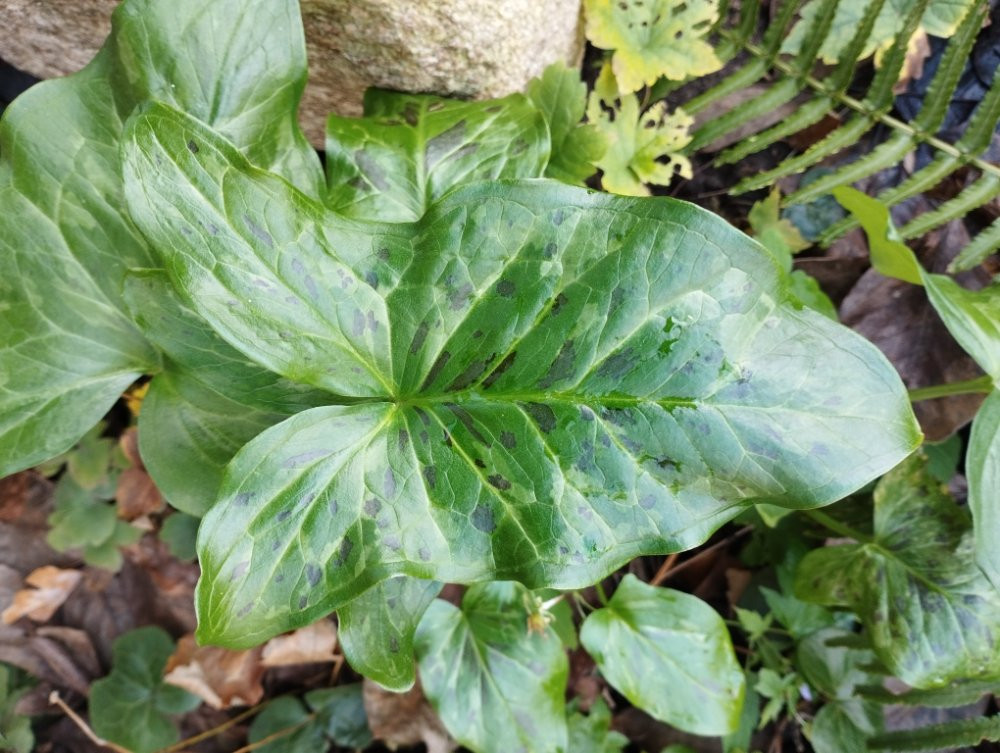 Arum ‚Lady Aron‘ zeichnet sich hier durch hellgrünes Laub aus. Zum Vergleich habe ich Blätter von Arum italicum und Arum italicum ‚Pictum‘ dazugelegt.