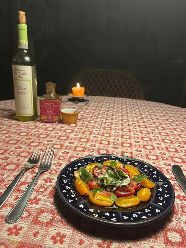 Vorspeise Insalata Caprese mit kampanischem Büffel-Mozzarella, orangen und roten Minitomaten und Basilikum, Hauptgericht Tagliatelle Arcobaleno aglio e olio zum Saint Émilion grand cru 2016