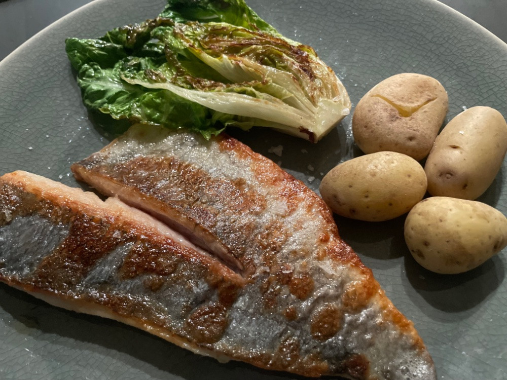 Bei uns gab es heute Doradenfilet, gebratenen Salat und ein paar Kartoffeln. Es gab noch Butter dazu.