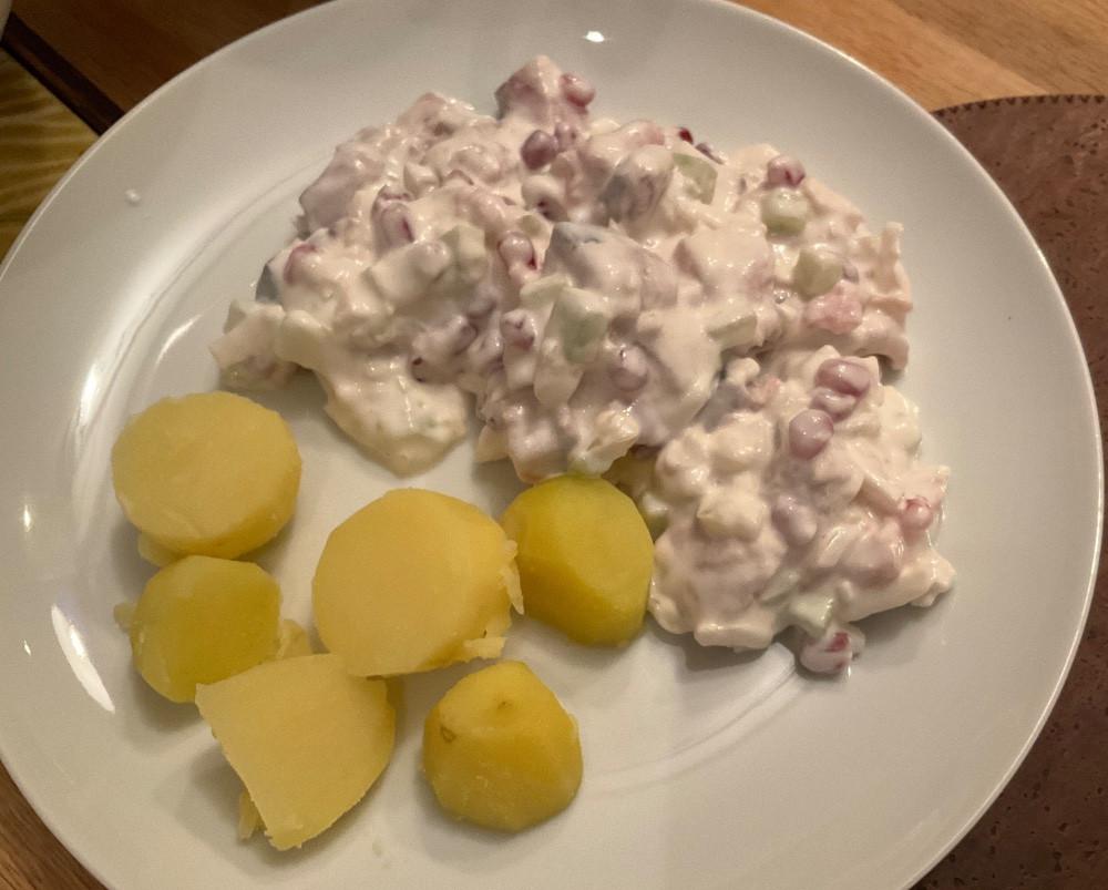 Heute hat GG gekocht, Matjes in Joghurt mit Granatapfel, Zwiebeln, Gurke und Knoblauch, dazu Kartoffeln.