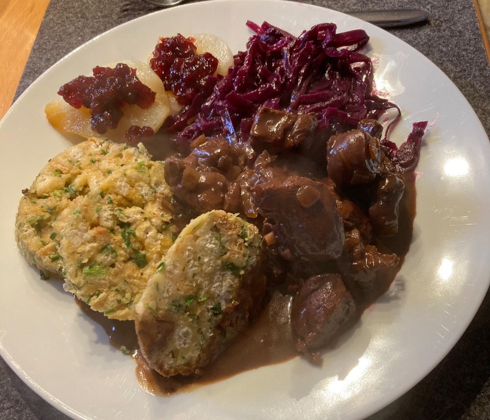 Heute ein feines Sonntagsessen. Rehgulasch, Rotkraut,Semmelknödel, Birne, Preiselbeeren.