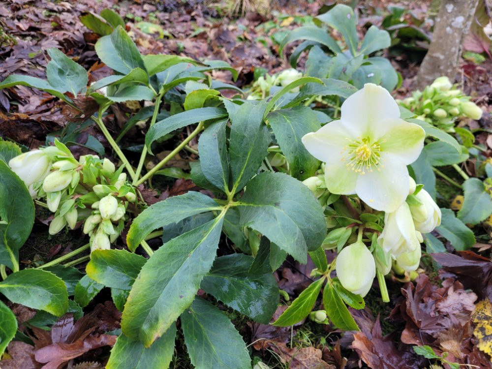 Die Lenzrosen blühen auch so, bei der üppigen Belaubung ist das aber auch kein Wunder.