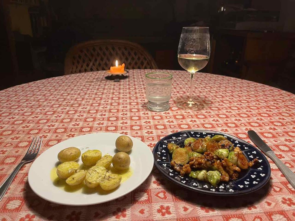 Heute Abend Rosenkohl mit Walnüssen und etwas Dattelsirup in Butter und Sesamöl gebraten und mit etwas Wasser abgelöscht sowie Drillingskartoffeln gedämpft und mit Butter und Rosmarin zum Chardonney 2021 aus Kanada